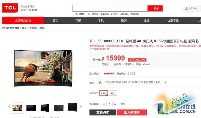 TCL最新发布的曲面旗舰产品H8800S-CUD至尊版,将高色域真彩技术和4000R曲率屏幕完美结合再加上哈曼卡顿的S级音响,能够创造超强临场感的音画效果。普通的LED背光液晶电视色域仅能实现NTSC色域范围下的72%,色彩纯度和丰富程度都十分有限。而TCLH8800系列至尊版曲面电视,采用真彩技术能够实现96%的色域覆盖范围。目前这款电视55英寸版,官网售价15999元,拍下立减1000元,相当于14999元。