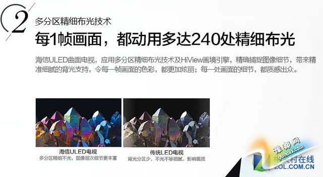 背光的原理一直是限制液晶电视画质提升的瓶颈,由于液晶面板本身不发光,图像的显示都需要依靠光线的照射,这使得电视在对比度和运动画面流畅性等方面一直很难提升。海信研制的ULED电视正是通过精细的动态布光技术,使得液晶电视的画质得到显著改善。今年海信发布了全新的720UC曲面ULED电视。将新一代的ULED技术和曲面屏幕相融合,创造了极为震撼的视觉效果。目前在天猫的海信官方旗舰店,55英寸的海信LED55K720UC电视售价为12999元,感兴趣的朋友可以点击进入海信旗舰店购买。