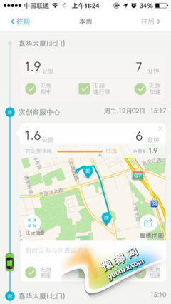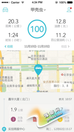 智能硬件一定要有行驶数据及轨迹全记录,我们点击主页面的行程卡片,可以展开行程详情。行程详情中记录了行程的总公里数、行程时间、起点终点、不良驾驶行为等数据。点击地图上左下角的放大按钮,还可以查看行程路线的详情,了解汽车行驶轨迹。