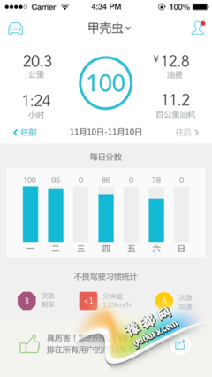 点击总分数,界面下方会出现每日分数详情,这里记录了每天所得的分数,本周的不良驾驶行为统计等。通过点击“分享”按钮,可以将自己的驾驶习惯分数分享到微信、朋友圈、微博、短信等第三方应用。