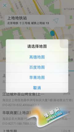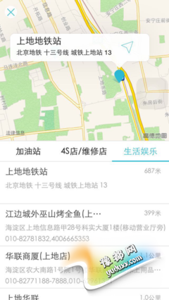 地图页显示了用户当前的位置和车辆最后的停车位置。点击右下角的导航按钮,可以一键从当前人的位置导航至车的位置。此外,点击界面左下角放大镜图标,会进入地图搜索页面。在这里可以查看到周边的加油站、4S店、生活娱乐等服务。通过点击目的地右侧的导航按钮,可以选择手机内装载的第三方软件进行导航,一键导航至所选地点。从而避免了再进入第三方地图软件进行查找路径的麻烦。