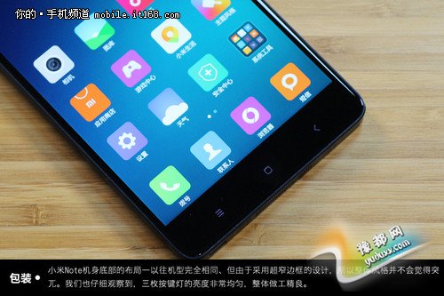 机身底部方面,配备了菜单键、HOME键和返回按键,属于小米手机的标准配置。发布会上,雷军也表示在正面屏幕更大的同时,小米Note正面长度要比iPhone6 Plus更短。时下各大厂商纷纷追求超高屏占比,其实原因很简单,正面屏幕占比越大越能够突出屏幕上显示的内容,减少多余设计对于用户使用手机带来的视觉干扰。小米Note在正面屏占比方面已经做到了业界领先,但仍然需要指出的是在屏幕BM区(俗称黑边)的控制上,小米还是没有魅族做的极致。小米选择用2.5D弧边在视觉上隐藏黑边也是一种折中的解决方案。