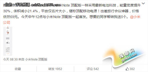 【IT168 资讯】今天早上,小米联合创始人、总裁林斌发微表示,新版10000mAh的小米移动电源即将到来。据悉这款产品采用与小米Note顶配版相同的电池技术,不管从能量密度还是体积都有了明显的提升。如果按照林斌的说法,这款小米移动电源简直可以堪称出差旅行的利器。新款小米移动电源将于今天中午12点首售,价格仅为69元。