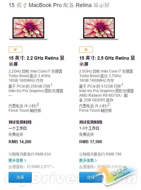 目前,新一代视网膜版MacBook Pro已经在苹果中国官方商城开卖,低配版送货时间为1个工作日,而高配版则是1-3个工作日。