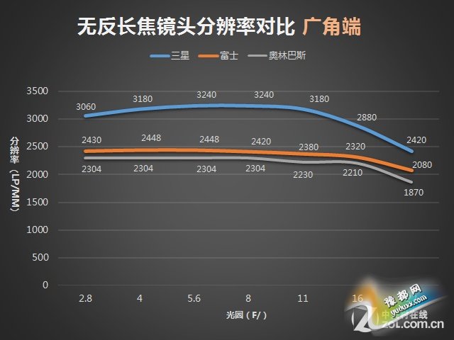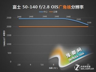 富士50-140mm镜头在三枚镜头中有着最好的成像曲线(分辨率下降最小)