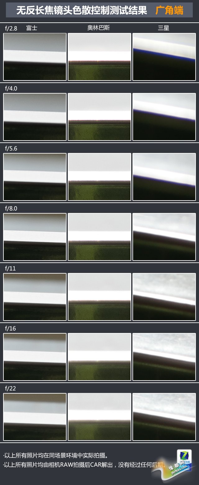 然后我们来看看不同镜头的色散控制表现,进入数码时代以来。拍摄照片中出现的紫边问题渐渐凸显出来,因此现代数码镜头的设计中,色散控制的表现显得越发的重要。那么这三枚在2014年发表的最新款无反镜头的表现如何呢,我们来对比看看:
