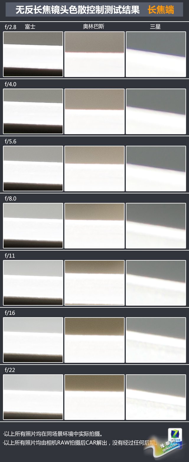 而在边缘失光控制方面,奥林巴斯的表现则是力压全场。这款M.ZUIKO DIGITAL ED 40-150mm F2.8 PRO无论是长焦端还是广角端基本仅在f/2.8光圈全开情况下有暗角出现,收缩一档光圈后就不再受暗角问题困扰,这种表现的确是相当优异。另外两枚镜头的暗角控制也是不错,除了f/2.8下的暗角较明显外,其他光圈档位下的暗角都较为轻微。而从镜头结构设计方面来看,的确富士和三星的更为复杂(两款镜头的镜片数量都达到和超过了20片),因此在暗角控制上稍逊也是情理之中。